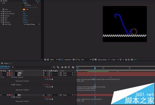 8、铁环的位置属性写好表达式,我们来写旋转,让铁环滚起来。