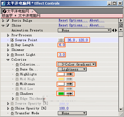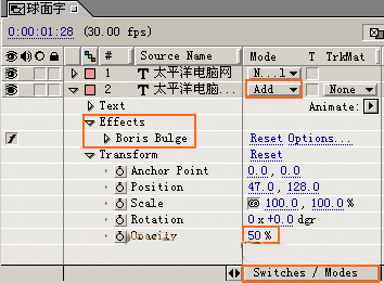 选择"太平洋电脑网"所在层,然后打开"Effect/Boris AE/ Boris Bulge"菜单选项,增加文字凸起(球面)效果,如图3所示。