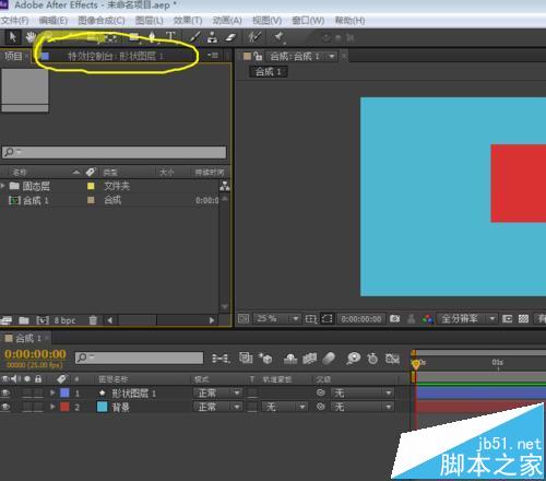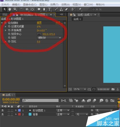1、打开AE软件,新建一个合成、背景、图形。在右边效果和预设直接搜索径向擦除就可以。(具体位置:效果——过渡——径向擦除),英文名字及位置(Effect——Transition——Radial Wipe)