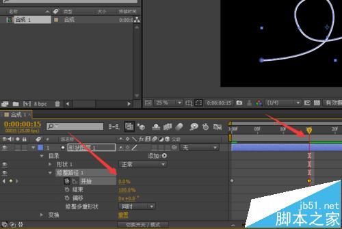 4、动画制作。点开修整路径的下拉按钮,然后把开始设置成100,并且设置一个关键帧。然后把时间指示器调整到15帧的位置,把开始设置成0。