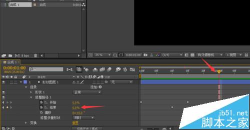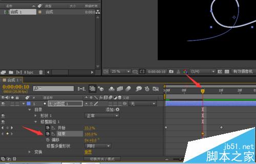 5、动画制作2。把时间指示器调整到10帧的位置,给结束添加一个关键帧。然后把时间指示器调整到1秒钟出,把结束参数设置为0。动画完成