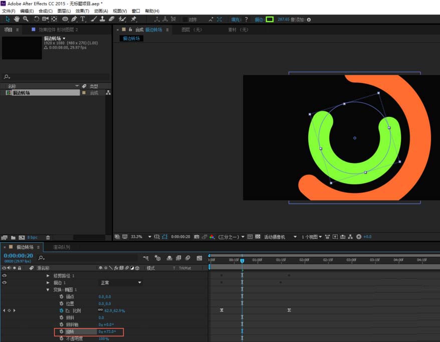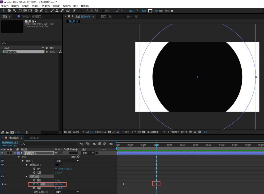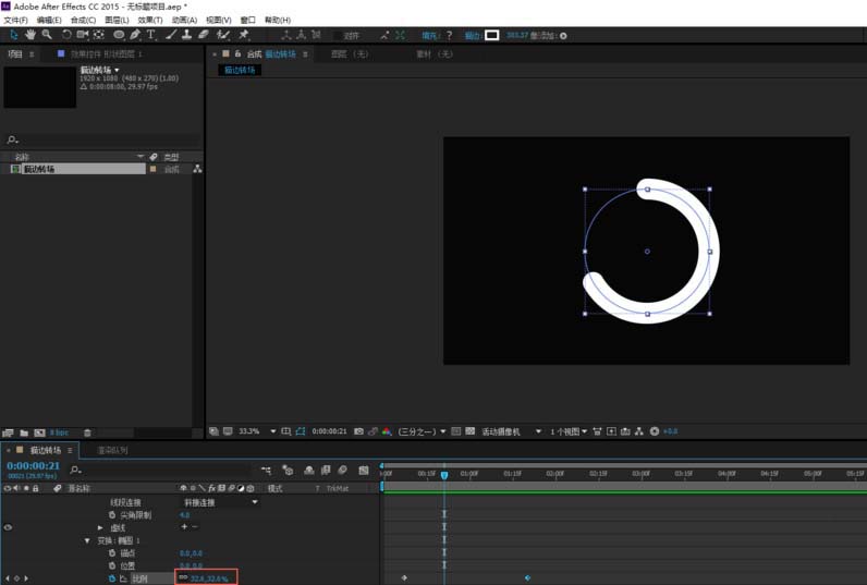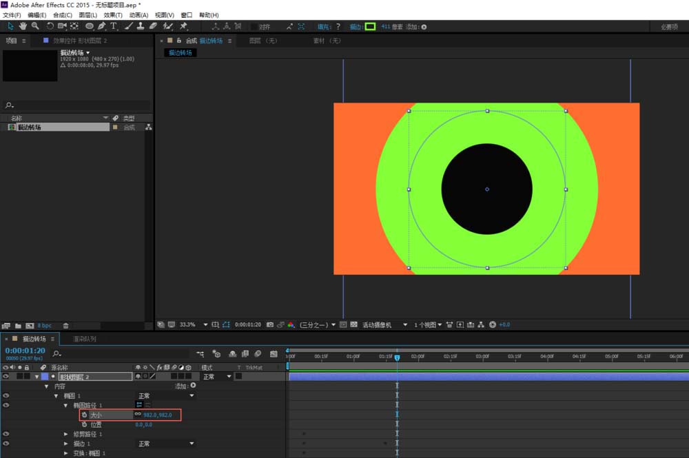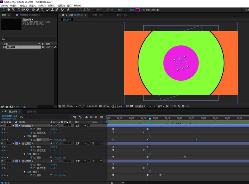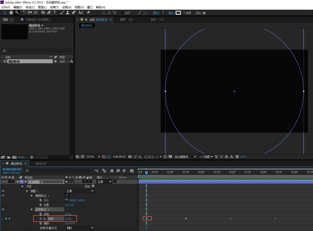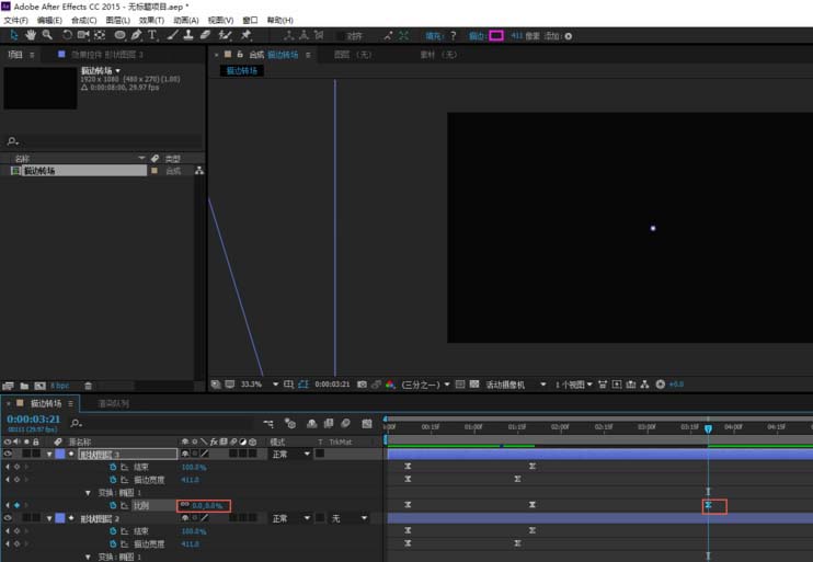 7、最内测的形状图层4圆环,如果我们也调打变换的比例,那么圆环将铺满整个屏幕,这显然是不合适的。所以我们要将比例调整为0%让圆环向内缩直至消失,这样描边实现转场的动画就制作完成了。