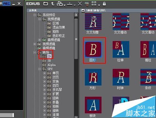 3、在特效面板中找到 转场-2D-圆形 特效。