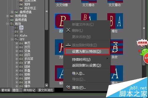 4、在特效 转场-2D-圆形 上单击鼠标右键,在弹出的右键菜单中选择 设置为默认转场效果。