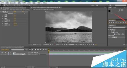 4、把图片拖到合成以后再在右边的效果与预设下面的搜索框搜索下雨,选择模拟仿真的CC下雨并拖到图片上。
