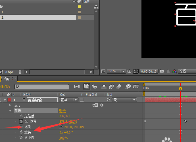 4、除此之外,文字的其他属性也可以做动画,比如,旋转、比例,都可以,大家尝试一下!