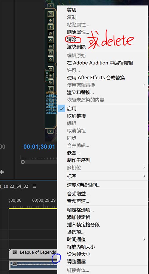 5、利用Ctrl+K、Delete(或右击删除)剪辑视频素材,截取想转换为GIF图片的部分