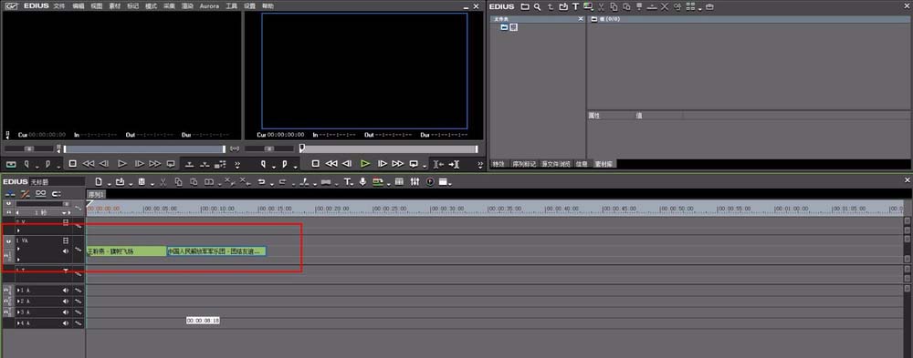2、然后在软件界面的视频轨道上我们拖进去两个素材文件,直接在电脑上选择素材文件拖放到界面轨道就可以了,放两个素材文件主要是一会试验一下波纹模式的特性,如图: