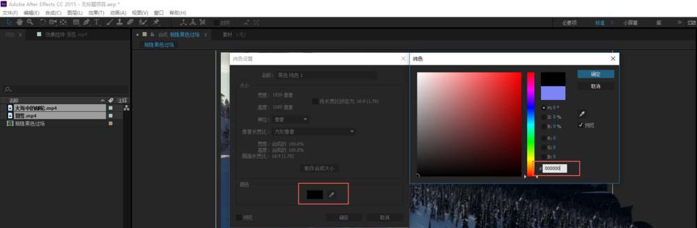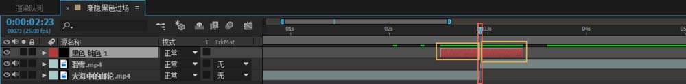 4、CTRL+Y新建一个纯色图层,设置图层的颜色为黑色;截断纯色图层,使得纯色图层在视频相连处各出入10帧左右;