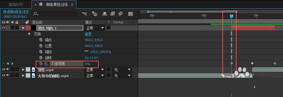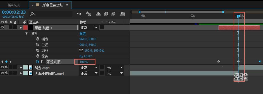5、单击纯色图层前面的小三角图标单击【变换】按钮,给【不透明度】打上关键帧;视频交叉处的【不透明度】设置为100%、两端设置为0%。这样一个简单的“ 制作完成了;