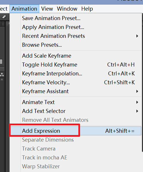 4、接着选择time remap,点击菜单栏【Animation】-【Add Expression】,添加表达式
