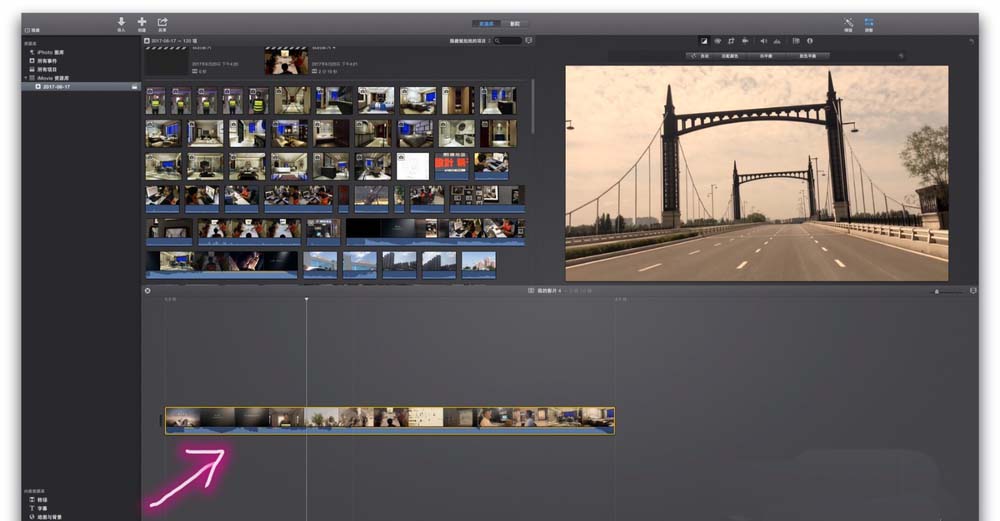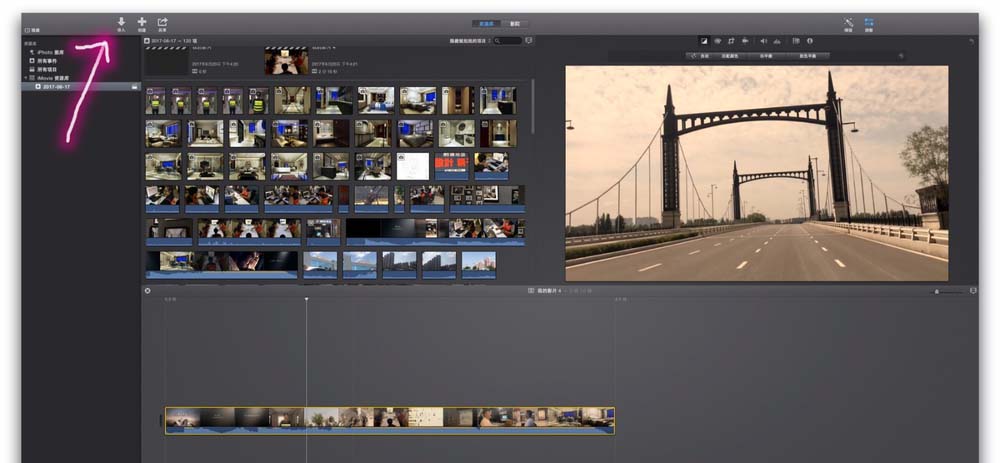 2、然后,打开iMovie应用,点击左上角那个朝下的箭头,将素材依次导入iMovie的素材框,如下图