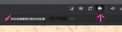 5、鼠标左键点击这排调整图标的第四个图标,是一个形状像摄像机的图标,之后下面会出现“对抖动视频进行防抖动处理”,鼠标左键点击前面的小方框,便会对选定视频进行防抖动处理。