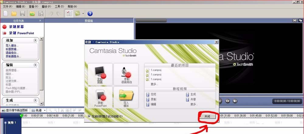 1、打开 Camtasia Studio 6,在向导对话框中选择“关闭”,关闭对话框,来到主界面。