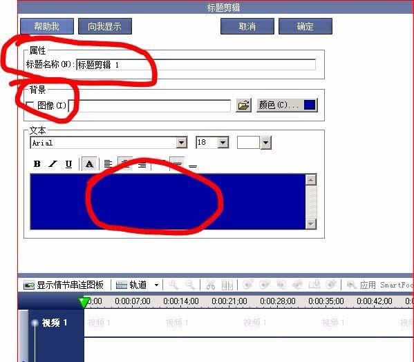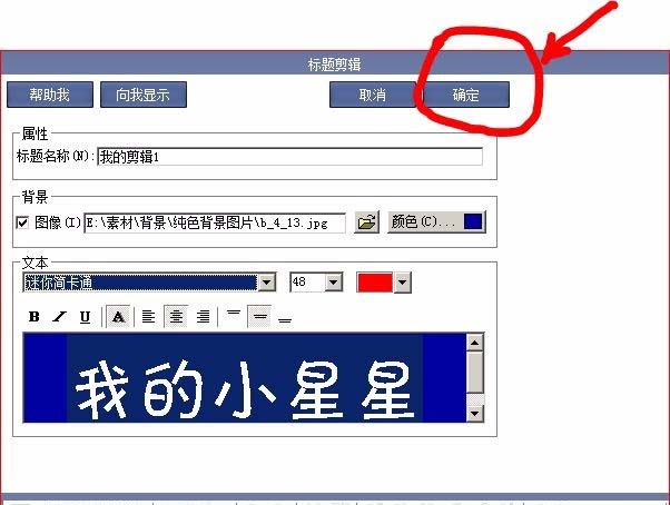 3、在“属性”中可以更改标题名称,在“背景”中可以自定义标题的背景,在“文本”输入框中可以更改标题剪辑的内容,单击“确定”完成。