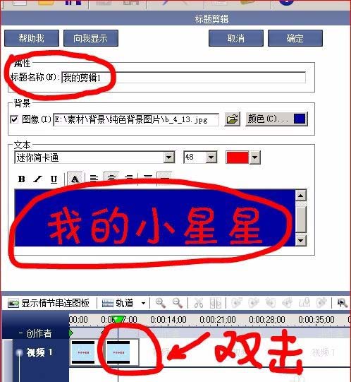 6、拖动剪辑箱里的这个标题剪辑到视频轨道上,然后重命名,(如把原来"我的剪辑1"改为"我的剪辑2")并更改标题剪辑中的文本内容,可以让视频的多个标题剪辑样式一致。