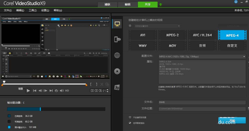 9、当以上的设置都完成之后,除了网络和DVD,其他的方式需要设置文件名和保存的位置,然后点击开始,文件就会开始渲染。
