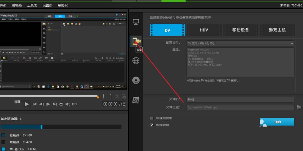 5、设备的渲染只要是在移动设备如手机,或者摄像机上播放,主要有DV/HDV/移动设备/游戏主机四种样式,这个根据自己的设备选择即可。