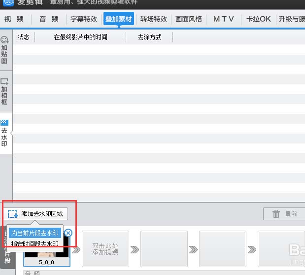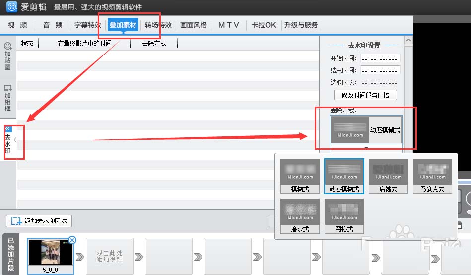 3、我们点击左边的“叠加素材”选项卡,然后选择“去水印”,我们还需要在右侧选择去除方式。