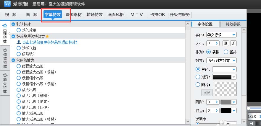 7、接下来我们就是添加自己的logo了。我们只是简单添加一个文字,然后文字的播放长度跟视频一样长。首先我们切换到“字幕特效”选项卡。