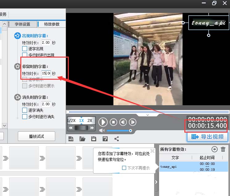 10、接下来我们设置字幕的停留时间和效果。这里我们主要是要设置字幕的停留时间,将字幕能够一直显示跟视频同长。