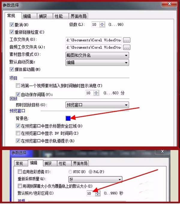 1、首先,启动会声会影,分别点击设置→参数选择→常规,将背景色改为蓝色。再点击编辑→默认照片/色彩区间设为为10秒,确定。(也可灵活)