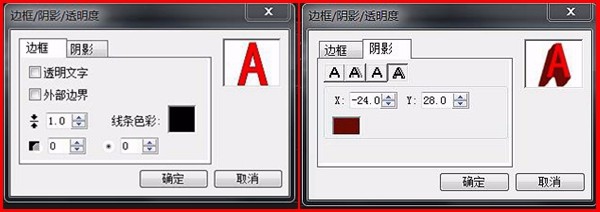 4、点击下面的“T边框/阴影/透明度”,先设置边框,如图左边;再点击阴影,点击第四个“A”(突起阴影),输入XY的数值分别为-24;28,右边有图可预览。如图右边。
