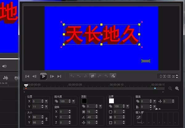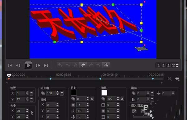 9、觉得满意了,就点击下面的“确定”。回到会声会影预览窗口再播放,接着点击上面的“分享”,输出视频(略)。在刚才的标题轨上双击,在预览窗口将文字拖曳选定,可以更换文字。在自定义界面改变文字的位置、大小、旋转,及此例未动的阴影、镜面等,还可以制作许多酷炫的效果。下面将另一种效果再展示一下。