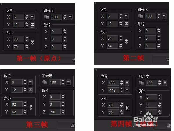8、再在原点右键,点击“全部复制并粘贴到右侧”再分别如图示,在时间轴大致位置双击,添加后3个关键帧,参数如下图所示。