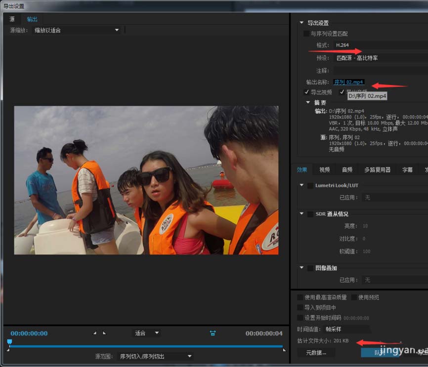 6、最后大功告成,需要的就是导出了,就在导入的选项下面。导出的时候记得选择格式一般MP4为主,就是选择H.264,点击导出名称不光可以改名字,还可以选择输出位置,这一点对于新手来说也很重要,经常会找不到最后的视频到哪了。