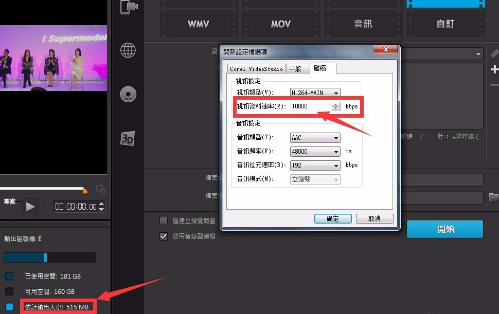 3、中间的:一般 一项默认,选择最后一项:压缩 找到视讯资料速率,默认10000。这时,我们改变速率为2500到5000之间均可,我选择改成了3000速率,点击确定后,我们看看大小,现在变成了100多M,是不是小了好几倍啊?放心,制作出视频后,画面还是非常清晰,