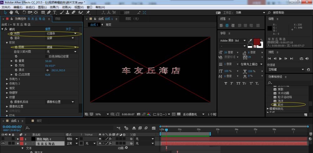 1、首先打开AE软件,新建合成。接着新建文字层,文字自定(在合成窗口选“标题/动作安全”进行文字的输入)。然后添加“碎片”效果到文字层上,下一步调整“碎片”效果。刚添加进的“碎片”效果,浏览文字,发现文字碎片呈砖块,我们需要的碎片像玻璃破碎一样的碎片,所以需修改形状下的图案,如图所示。