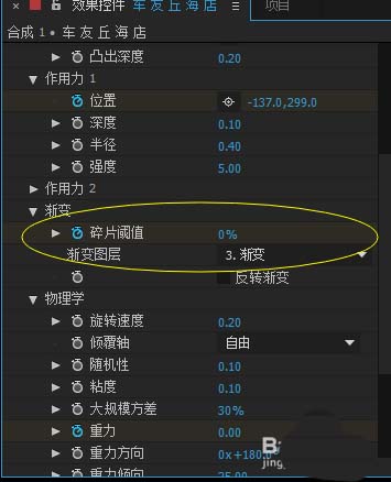 3、预览之后(按空格键或小键盘0预览)发现碎片效果不是很好,我们理想的效果是碎片从左到右炸开,并且碎片倾斜向右随重力落下去。打开“碎片”-“渐变”,我们来调整渐变里面的参数。