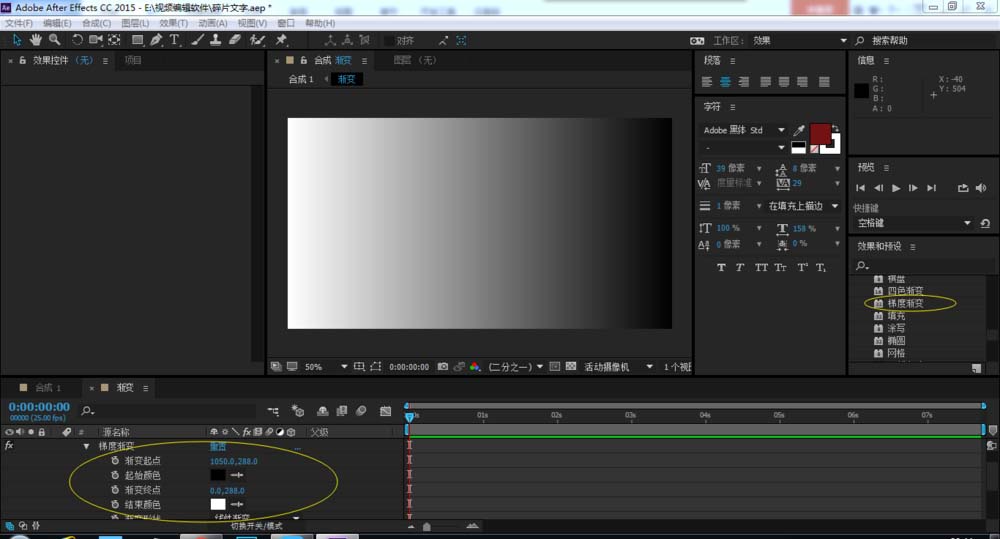 4、因为“渐变”里有个“渐变图层”,“渐变图层”需要基于一个渐变合成里才得以展现碎片文字更好的效果,所以再新建一个合成(背景色为黑色)。命名为:渐变,加入一个“渐变效果”(在生成里的“梯度渐变”),调整“渐变效果”参数,如图所示。