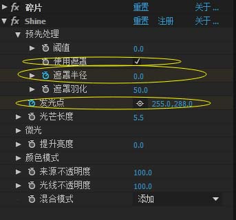 6、为了使文字碎片效果更加炫丽多彩。我们再加个插件和“镜头光晕”,这个插件就是shine,“shine”效果调整“发光点”和“遮罩半径”的动画就可以了。要先勾选“使用遮罩”,发光点的动画跟随碎片效果动画的关键帧,但发光点的发光位置要符合碎片效果动画的始末爆破光效。“遮罩半径”的动画也一样。可以再设置“光芒长度”参数,实现碎片文字光线。