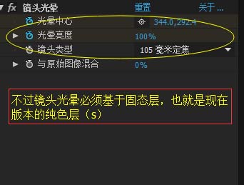 7、最后一步就是“镜头光晕”。“镜头光晕”和“shine”类似,一个“镜头光晕”的位置动画和亮度动画,关键帧同步碎片效果动画的关键帧,区别就在于“镜头光晕”要在固态层(背景色必须是黑色)里才能实现。“镜头类型”选105毫米定焦。固态层的图层模式设为“相加”。