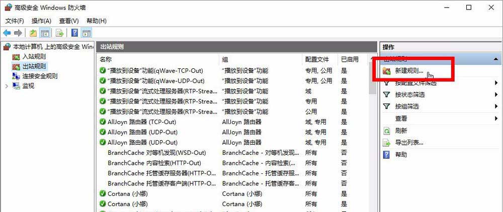 2、点击左侧栏的出站规则,然后可以看到右侧的“新建规则”按钮,点击它