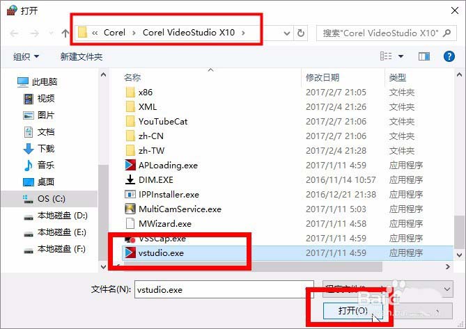 5、选择会声会影主程序(vstudio.exe),然后点击“打开”
