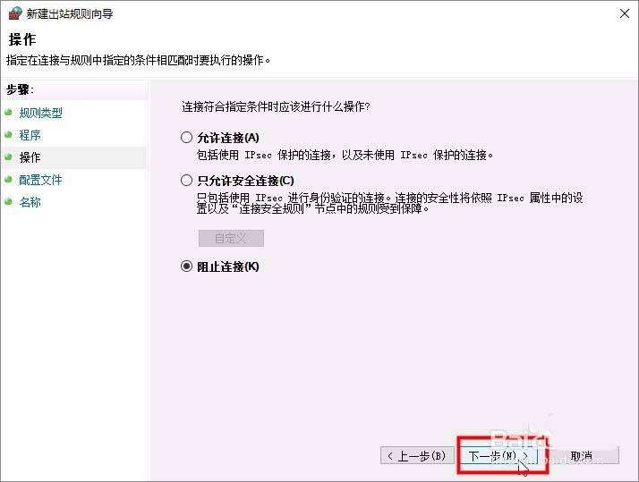 7、弹出下图所示的窗口,默认勾选“阻止连接”,也就是阻止选择的exe程序联网。继续“下一步”