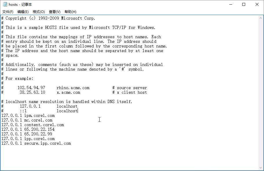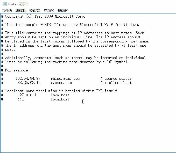 2、用记事本打开已经复制到桌面的hosts文件,可以看到下图所示的内容