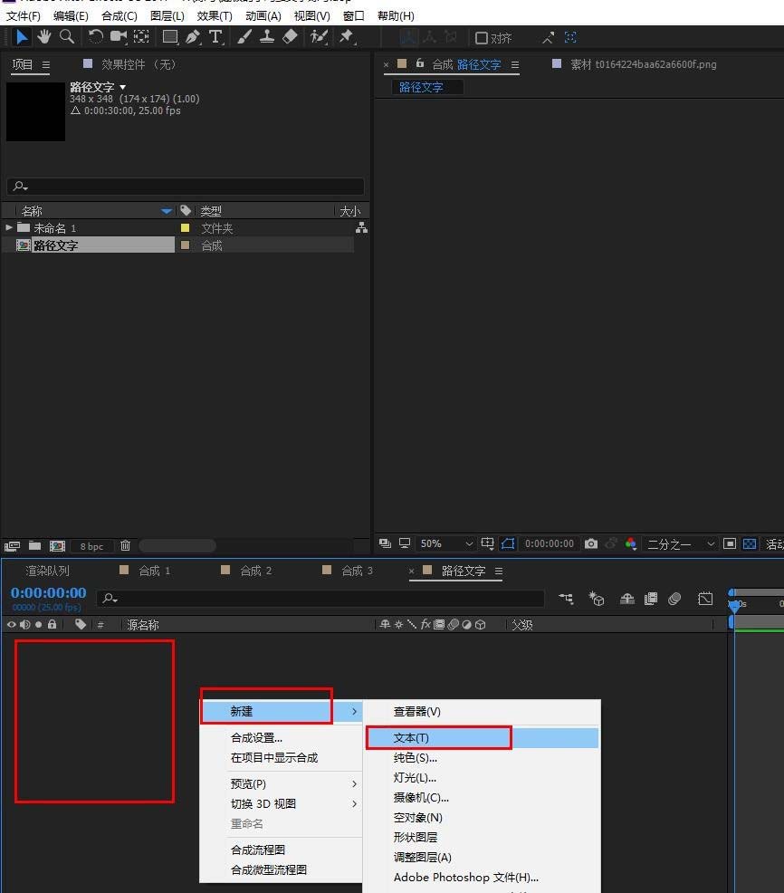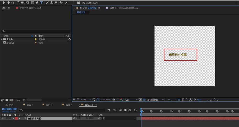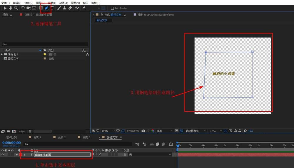5、单击文本图层,然后选择左上角的钢笔工具,用钢笔工具在合成面板中绘制自己需要的路径。(如图中的方形路径)