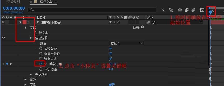 6、将时间轴放在文字运动路径的起始时间点。点击文本图层前的小三角符号→文本前面的小三角符号→路径选项前面的小三角符号。在出现的子菜单中找到”首字边距“单击前面的类似小秒表的图标,设置起始关键帧