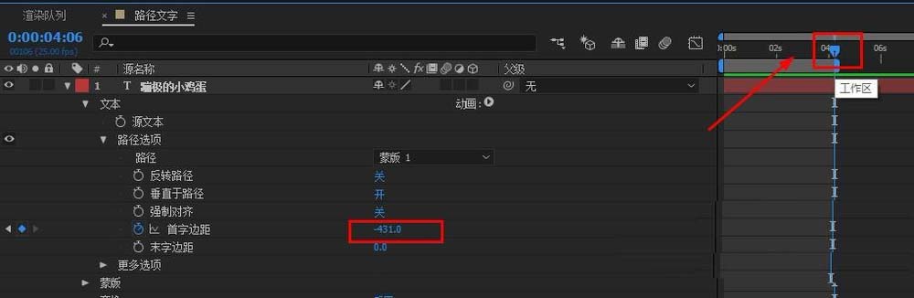 7、将时间轴移动到文字运动的结束时间点。更改路径选项的参数确定文字运动结束的关键帧。
