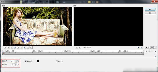 5、将修剪滤镜拖到覆叠轨2的图片上,双击图片,点击“自定义滤镜”。然后在起始帧位置将中心点调到最右边,宽度0高度100;终止帧位置中心点调到中心,宽度100高度100,即照片从又向左显示出来。