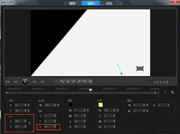 2、在白色色块上右键单击选择“自定义动作”,将大小调整到200,旋转的Z值调整到50,这样色块就是一个倾斜的。然后调整起始帧和终止帧的位置,让色块由右下角向左上角运动;