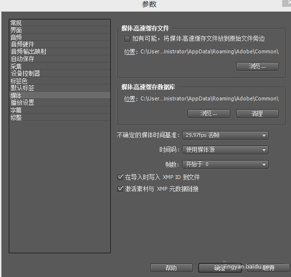 2、设定了存放盘后,学会清理垃圾。点击编辑--参数--媒体,即可参看,媒体高速缓存文件,要将媒体高速缓存文件更改在其他盘内,此外,确定近期对于工程文件无更改的,也可以对缓存文件进行清理处理。