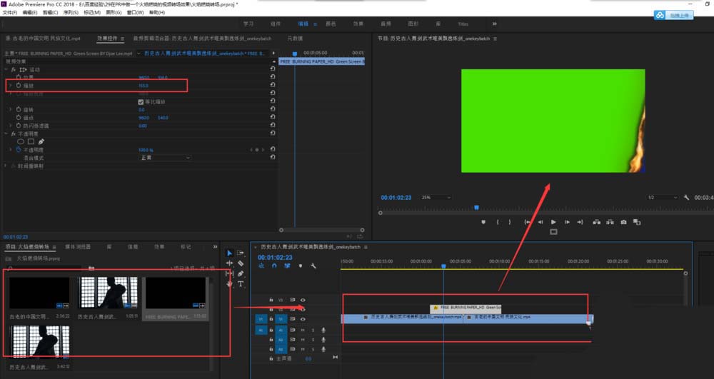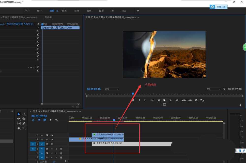 3、将两个视频媒体素材拖入到时间轴窗口中,两个视频媒体都放在同一视频轨道上;然后再将火焰燃烧的素材也拖入视频轨道中,放在两个视频媒体的上面,调整好位置,放在两个视频重合的部分,然后将火焰燃烧的素材放大,将轨道1的画面完全遮住。