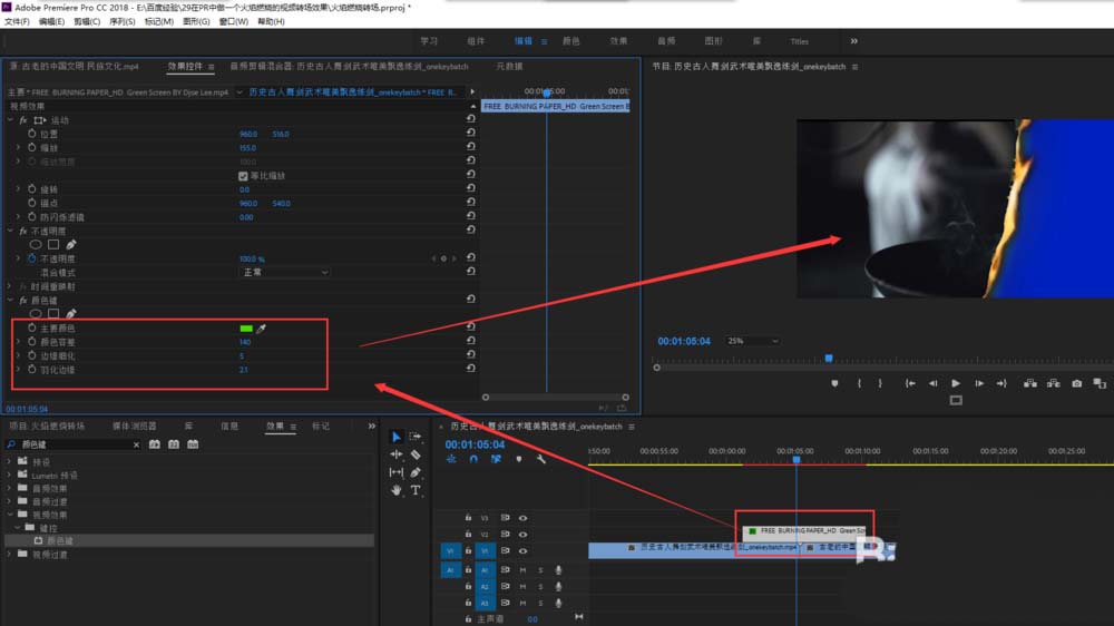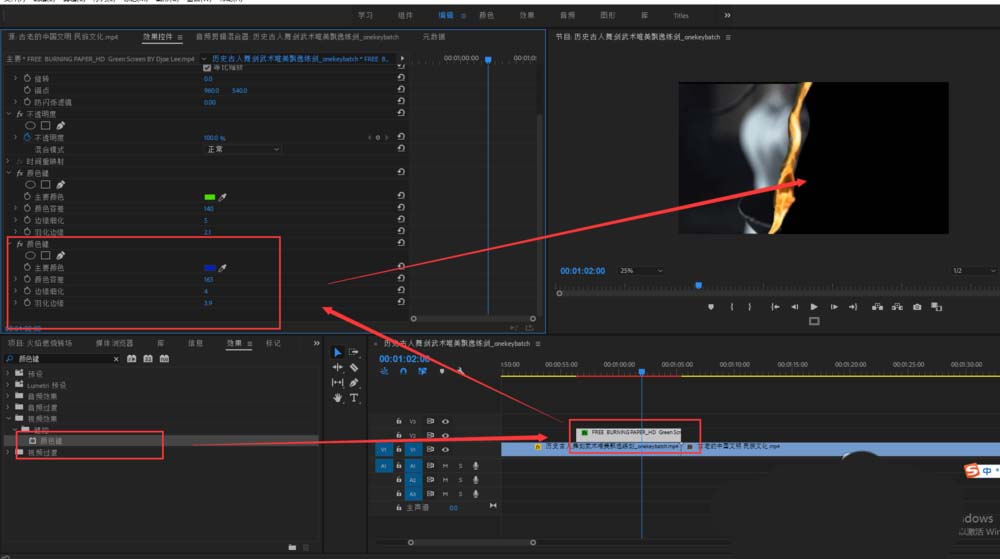 5、选中轨道2的火焰素材,打开效果控件窗口,找到添加的颜色键效果,选择火焰素材中的绿色,然后设置颜色容差、边缘细化、羽化边缘的数值使得绿色完全消失即可。