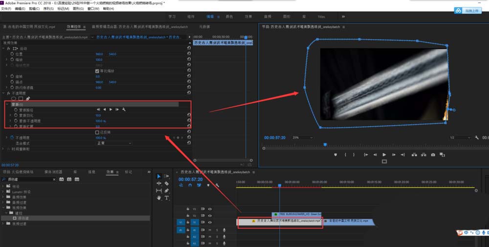 6、选择轨道1中的第一段视频素材,用蒙版画出一个遮罩,在第一段视频媒体与火焰素材的开始蒙版的大小将整个画面遮住,然后隔一段时间,重新打入一个关键帧,并沿着火焰燃烧的形状边缘调整蒙版的形状,一直到火焰素材结束为止。