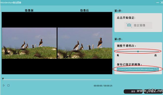 随后,点击播放按钮预览效果。你还可以拖动滑杆调整平滑档次,并且选择目标路径保存已稳定的视频片段。最后,别忘了点击保存按钮以应用稳像处理噢!